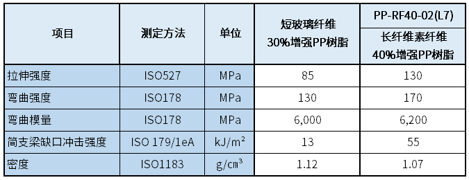表1 : 长纤维素纤维增强PP树脂与短玻璃纤维增强PP树脂的比较